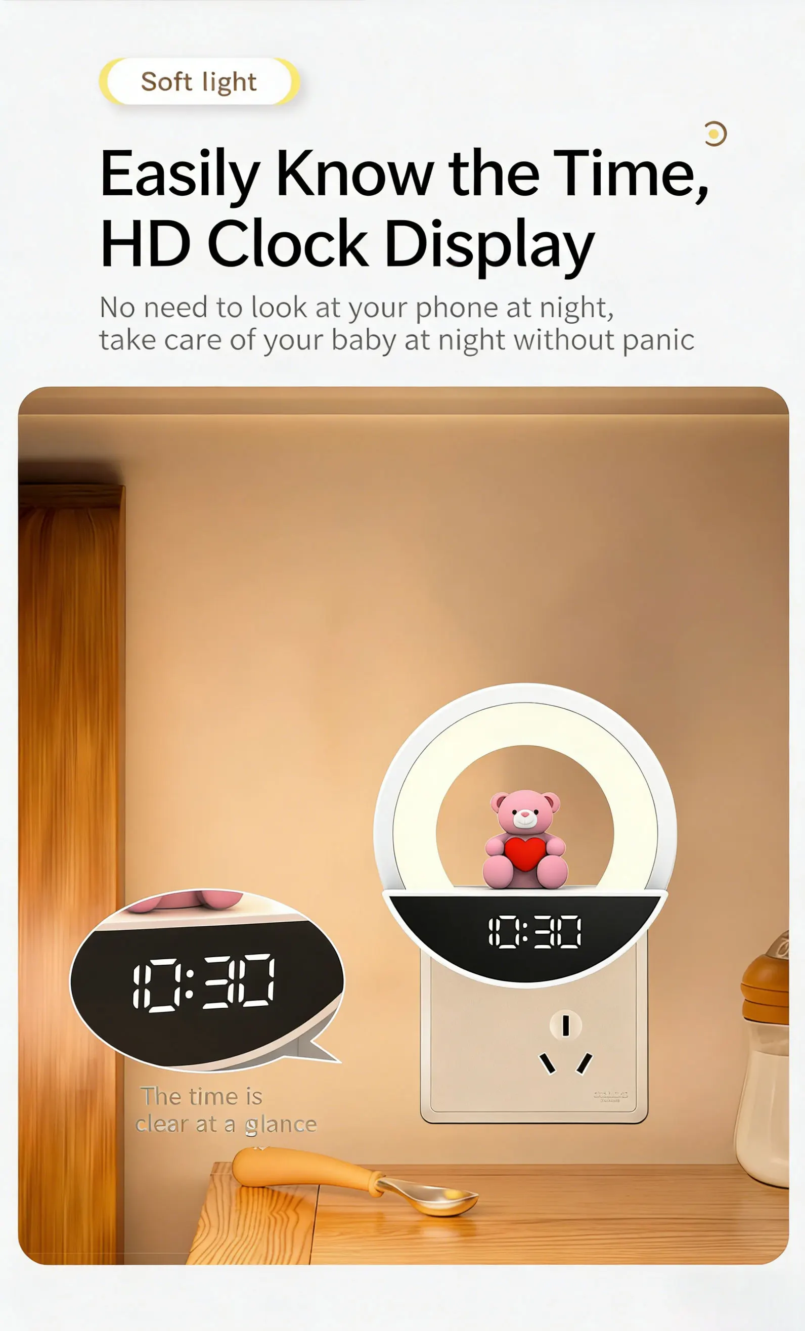 The integrated multifunctional design combines lighting with a user experience that is gentle and eye-friendly. The circular structure ensures even diffusion of light. providing a soft and non-dazzling illumination without flicker or blue light. It not only meets the basic lighting needs for nighttime activities and bedtime reading. but also won't irritate the eyes. making it especially suitable for children and people with sensitive eyes.